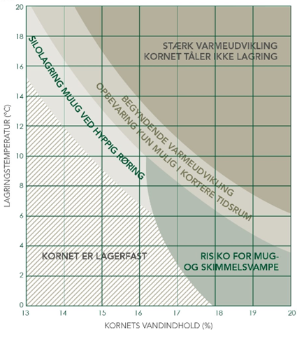 Figuren nedenfor viser kornets lagerfasthed i forhold til dets temperatur og vandindhold.