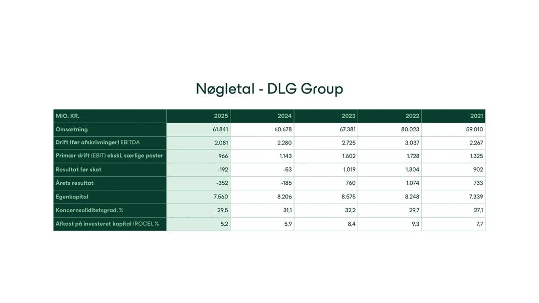 Koncernens bruttoomsætning steg til 61,8 mia. kr. mod 60,7 mia. kr. i 2024, mens driftsresultatet før afskrivninger (EBITDA) landede på 2,1 mia. kr. mod 2,3 mia. kr. DLG Group leverede samlet en underliggende EBITDA-margin på 3,6 %, men niveauet er ikke tilfredsstillende, da der både er et større potentiale og et klart behov for at styrke indtjeningen for at muliggøre investeringer i vækst og operationelle forbedringer i de kommende år.